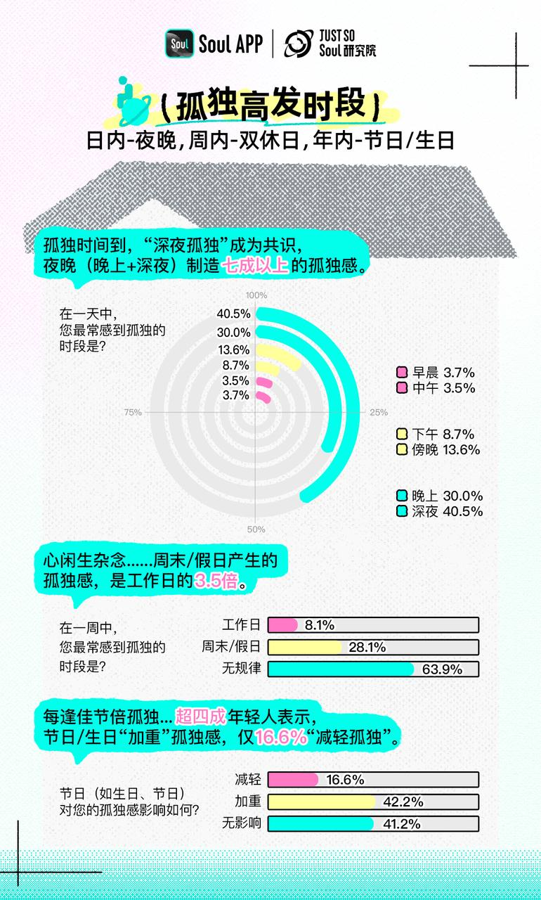 在较长的一周周期之中,周末/假日产生的孤独时刻是工作日的 3.5 倍之多;而在年内,42.2%的年轻人表示节日/生日会“加重”自己的孤独感,前者是喜气洋洋的乐景衬托出“作者”的哀情,后者是越长大越孤单,越长大越不安……